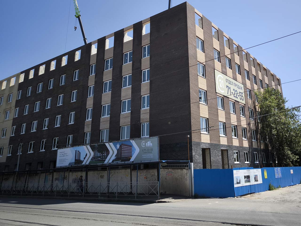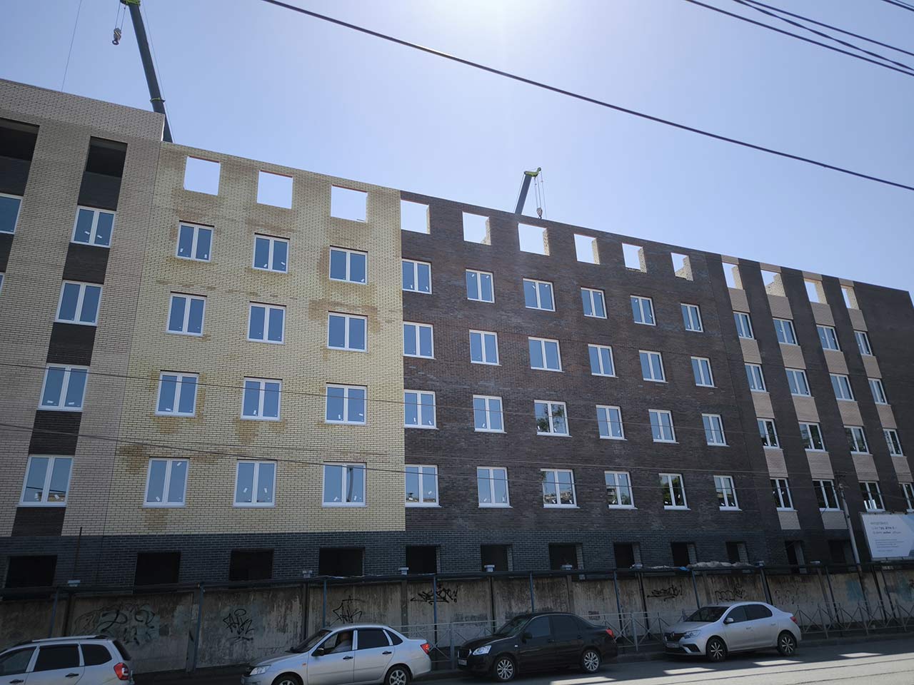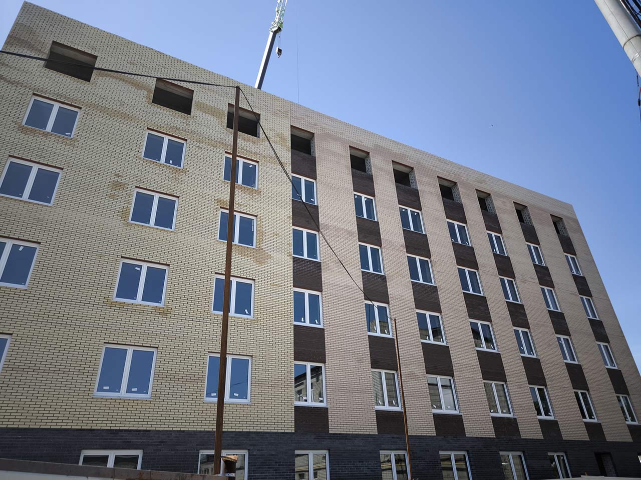 Выполнены работы по устройству ограждающих конструкций 4-го и 5-го этажа. Производятся работы по устройству ограждающих конструкций 6-го этажа с последующим устройством плит перекрытий и возведением парапета.
